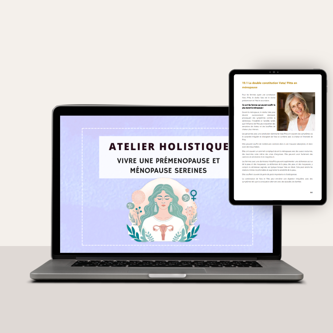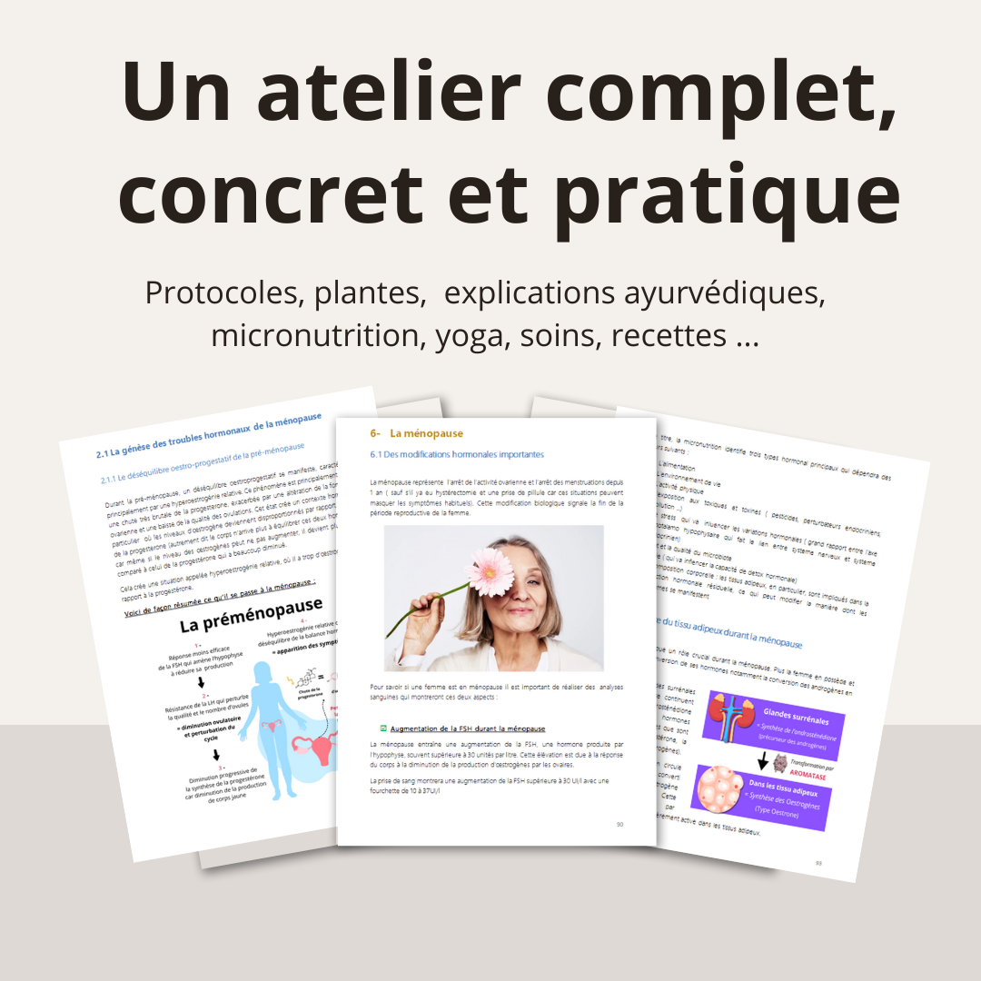 Vous découvrirez des solutions naturelles, et et soins issus de l'Ayurvéda et de la micronutrition pour vivre cette transition sereinement et en pleine santé !
