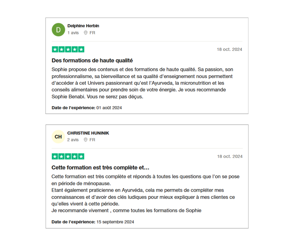 "J'ai trouvé cet atelier extrêmement fourni ! Une grille de lecture très fine sur l'ayurvéda et le lien très clair et bien fait entre l'ayurvéda et une physiologie plus occidentale et les hormones.